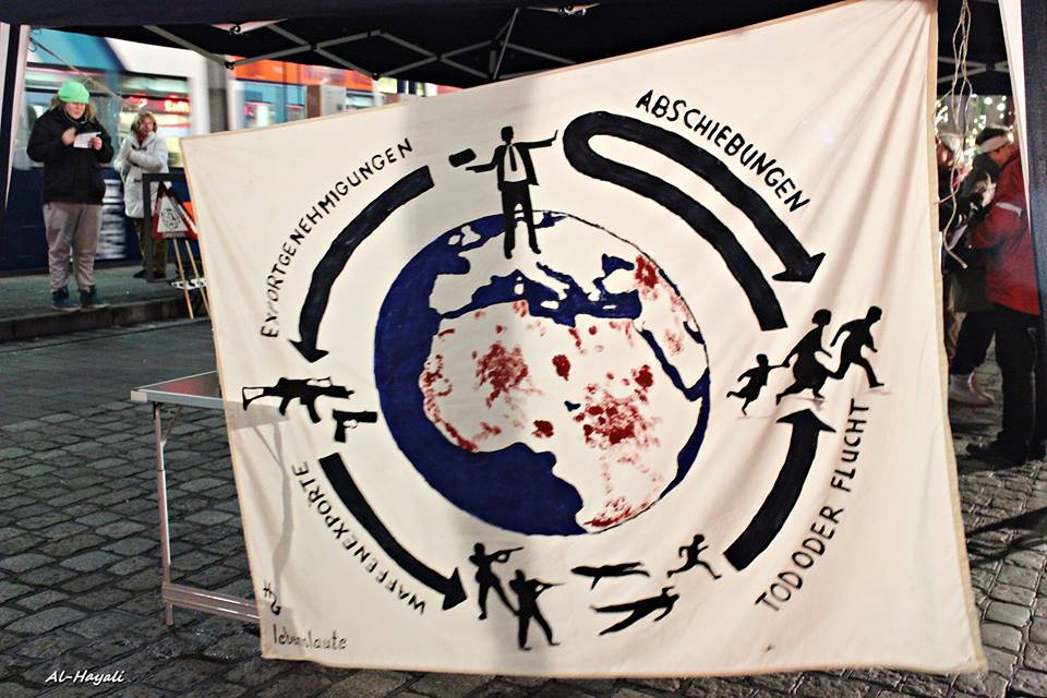 Auch die Deutsche Friedensgesellschaft-Vereinigte KriegsdienstgegnerInnen (DFG-VK) und das Friedensplenum Mannheim haben zu dieser Aktion aufgerufen und dafür geworben. Wir haben dabei auf wesentliche Ursachen für Fluchtbewegungen hingewiesen: Rüstungsexporte und Militäreinsätze.