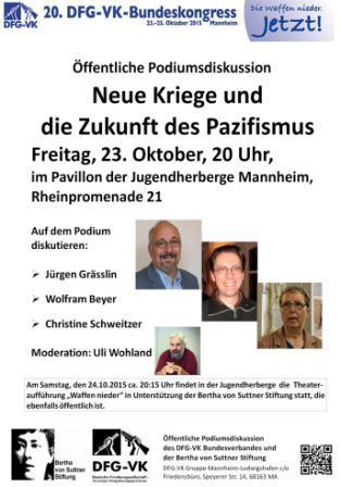Öffentliche Veranstaltung der Deutschen Friedensgesellschaft-Vereinigte KriegsdienstgegenrInnen und Bertha von Suttner Stiftung im Rahmen des 20. Bundeskongress der DFG-VK. Auf dem Podium diskutieren: