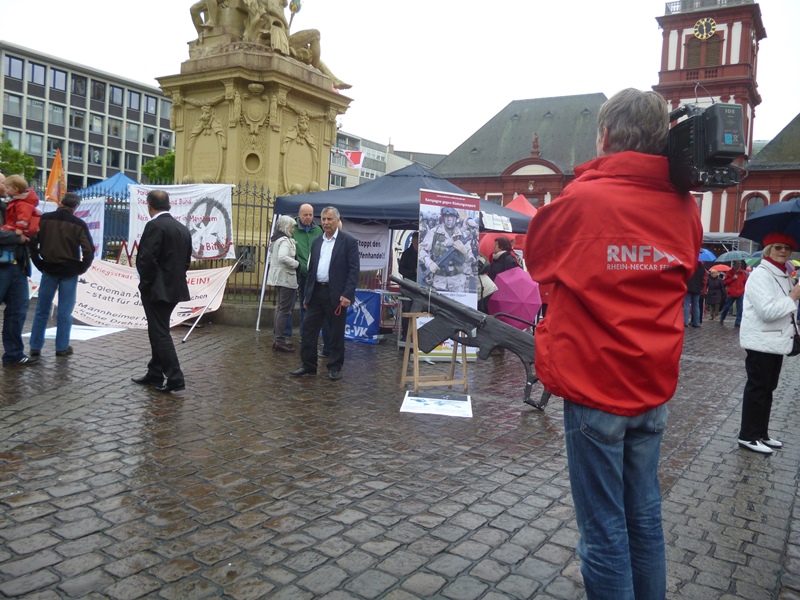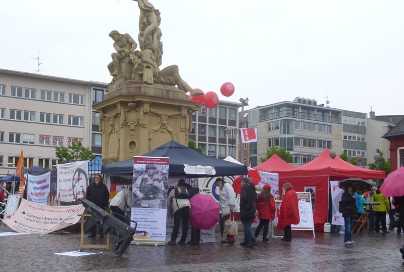 Die DFG-VK hatte am Infotisch einen Brief an die Mannheimer Bundestagsabgeordneten ausgelegt. Darin werden die MdB aufgefordert, sich für ein Verbot des Waffenhandels einzusetzen. Viele nutzen die Möglichkeit, sich dem Brief anzuschließen, indem sie diesen mit ihrer Unterschrift und Anschrift versahen. Der Infostand stieß bei vielen auf Interesse und es gab interessante Gespräche und überzeugende Argumente. So wurde etwa zum G36-Skandal kritisiert, dass es schlimm ist, wenn Politiker_innen sich darum sorgen, dass ein ineffizientes G36 Bundeswehrsoldaten in Gefahr bringen kann, aber das Leben von Menschen, die mit dem G36 (im „Normalbetrieb“) umgebracht werden, unerheblich ist. Gefragt wurde außerdem wie unfähig und/oder korrupt das Verteidigungsministerium sein muss, wenn sie ein Gewehr beschafft, welches die Anforderungen (effizient zu töten) nicht erfüllt. Das G36 ist kein Einzelfall für eine unfähige Militärbürokratie, wenn man an die über Hundert abgestürzten Starfighter-Bombenflugzeug denkt.