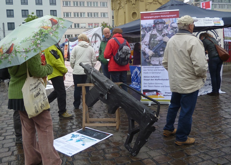 Am Infostand zog ein überdimensionales Gewehr aus Pappmaschee viele Blicke auf sich. Anders als die Attrappe ist das G36-Gewehr von Heckler & Koch bestens geeignet Menschen umzubringen. Auch wenn das G36 bei heißem Klima oder bei Dauerfeuer nicht optimal tötet, haben Soldaten, Paramilitärs und (korrupte) Polizisten (siehe Mexiko) schon viel zu viele Menschen damit umbringen können. Weil die deutsche Bundesregierung den Export von G36-Gewehren und anderen Waffen genehmigt, ist sie mitverantwortlich dafür, dass H & K Deutschlands „tödlichstes Unternehmen“ (Zitat Jürgen Grässlin) wurde. DFG-VK und Friedensplenum Mannheim sind daher Mitglied der Kampagne „Aktion Aufschrei – Stoppt den Waffenhandel!“ und setzen sich dafür ein, dass die Bundestagsabgeordneten das Friedensgebot des Artikels 26 Absatz 2 des Grundgesetzes durch ein Rüstungsexportverbot ergänzen.