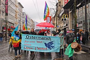 Ostermarsch Mannheim 2015Über 200 Menschen gehen für Abrüstung und gegen die NATO auf die StraßeTrotz schlechtem Wetter kamen am 4. April 2015 mehr als 200 Menschen zu der von DFG-VK und Friedensplenum Mannheim veranstalteten Kundgebung und Demo. Auch Dauerregen hielt die circa 30 RadlerInnen nicht davon ab, zur Coleman-Kaserne zu radeln um dort bei der Abschlusskundgebung nachdrücklich von der US-Armee deren Freigabe zu fordern. Weiterlesen: Ostermarsch Mannheim 2015 Seite 6 von 15 |