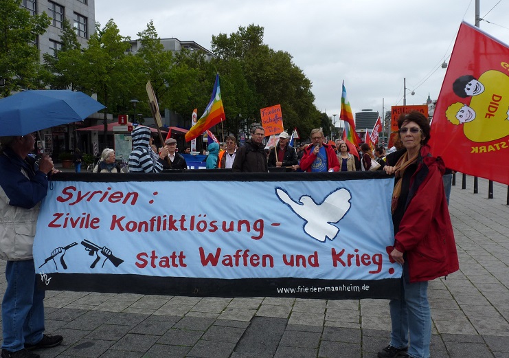 Die Zuspitzung des Syrienkrieges wegen des furchtbaren Giftgaseinsatzes und des von Präsident Obama geplanten Militärschlages gegen das Assad-Regie veranlasste das Friedensplenum Mannheim, sich rasch und öffentlich für eine zivile Konflikt-bearbeitung einzusetzen. Nach einer kurzen einwöchigen Vorbereitung versammelten sich am 14.9.2013 über 100 Personen auf den Paradeplatz. Das werten die Veranstalter als einen ermutigenden Erfolg.