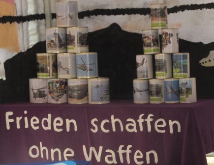 Wer sich die Dosen genauer ansah erkannte, dass sie mit Fotos der altbekannten Tötungsinstrumente - Waffen - beklebt waren. Diese galt es mit drei Ballwürfen abzuräumen. Spielerisch und symbolisch ging es also darum, Waffen zum Verschwinden zu bringen und Frieden eben ohne Waffen zu schaffen. Abrüstung ist kein (Kinder-)Spiel und bedarf eines permanenten und beharrlichen Engagementes z. B. indem man Petitionen unterzeichnet. Ein aktuelles Mitmachangebot ist die Unterschriftensammlung für ein Exportverbot für Kleinwaffen, welches die Aktion Aufschrei - Stoppt den Waffenhandel! propagiert.