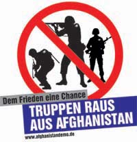 Jetzt sollen noch 40.000 weitere Soldatinnen und Soldaten in Afghanistan Krieg führen. Mit der Mehrheit der Bevölkerung sagen wir dazu Nein. Wir fordern die Bundestagsabgeordneten auf: Stimmen Sie mit Nein! Schicken Sie keine weiteren Truppen, sondern ziehen Sie diese ab! Nur dann hat der Frieden eine Chance, können die humanitären Hilfsorganisationen ungefährdet arbeiten.