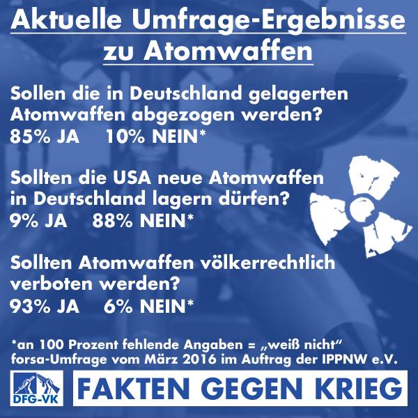 Mit dieser Petition fordern die Unterzeichnenden die Bundesregierung auf, entsprechend dem Wunsch der überwältigenden Mehrheit der BundesbürgerInnen (siehe Grafik), die nukleare Aufrüstung in Deutschland zu verhindern, sich tatkräftig für den Abzug der Atomwaffen aus Büchel einzusetzen und diplomatische Schritte für ein Atomwaffenverbot zu unterstützen.