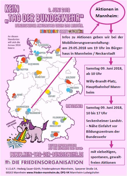 Mit Aktionen vor dem Bundeswehr-Standort in MA-Neuostheim und am Bahnhof setzten sich Friedensplenum Mannheim und DFG-VK MA-LU sowie andere Organisationen dafür ein, dass der Selbstbeweihräucherungstag der Bundeswehr nicht ohne kritischen Stimmen über die Bühne ging.