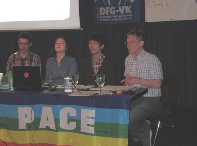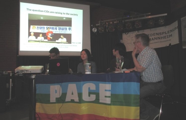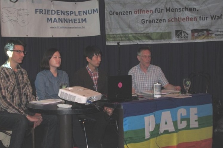 Zwei Friedensaktivisten aus Südkorea informierten am 23. April.2015 im Mannheimer Forum Jugendkulturzentrum über Kriegsdienstverweigerung und Antikriegsarbeit in ihrem Land.