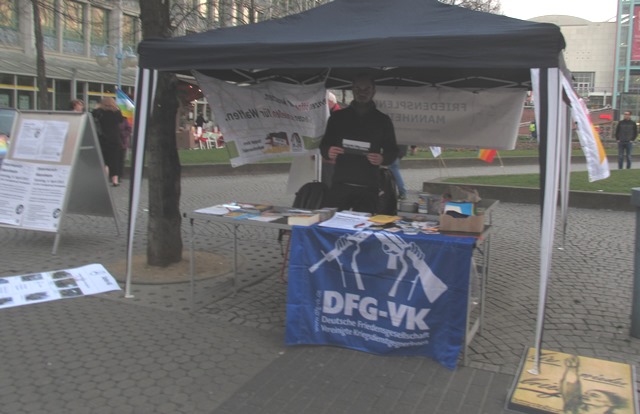 Deutsche Friedensgesellschaft-Vereinigte KriegsdienstgegnerInnen (DFG-VK ) und Friedensplenum Mannheim werten es als einen großen Erfolg, dass sich der Petitionsausschuss des Deutschen Bundestags am 23. März 2015, 12 Uhr mit der Forderung der Kampagne Aktion Aufschrei – Stoppt den Waffenhandel beschäftigt, ein grundsätzliches Verbot von Rüstungsexporten in Artikel 26, Absatz 2 aufzunehmen. Doch es ist auch weiter nötig, auf Politik und Rüstungsfirmen Druck auszuüben, weil sich an der Rüstungsexportpolitik wenig geändert hat. Deshalb haben wir am 23.3.2015 mit einem Infostand auf dem Paradeplatz Informationsmaterial verteilt und mit den Passanten diskutiert.
