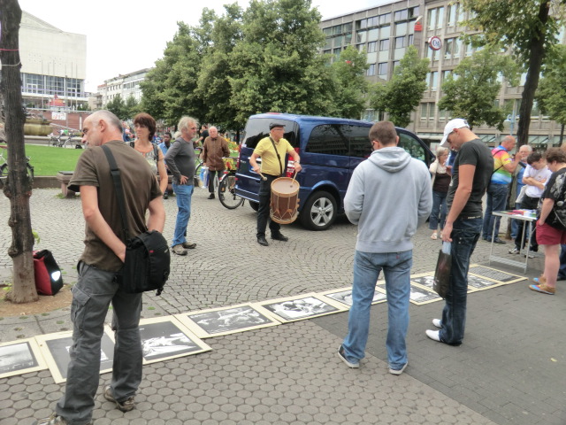 Die neuen großflächigen Stelltafeln des Friedensplenums fanden (wie bereits bei der DGB-Mai-Kundgebung) starke Beachtung. Aufmerksam wurde gelesen, welche Firmen beim Leopard-Panzer beteiligt sind und mit welchen Militär-Versionen ihrer LKW die Daimler AG Geld verdient und dass sie Beteiligungen an EADS und MTU/Tognum hält. Auch die Stelltafel über die Kampagne Aufschrei – Stoppt den Waffenhandel! und aufbereitete Daten über Rüstungsempfänger und –lieferanten fanden Interesse. Das erleichterte es, die BesucherInnen um ihre Unterschrift für ein Waffenexportverbot zu bitten. Mit Erfolg: denn es kamen wieder fast 100 Unterschriften hinzu.
